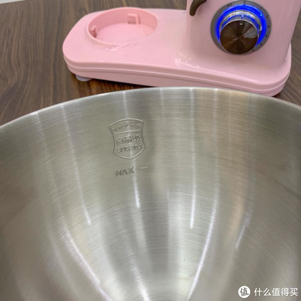厨师机的档位通上电之后有绚丽的蓝光,个性十足。档位是有8档,加上一个点动档。我们再来看一下和面桶,它有5升之大,印有304食品级钢印,可直接与食材接触,所以可以放心使用啦。