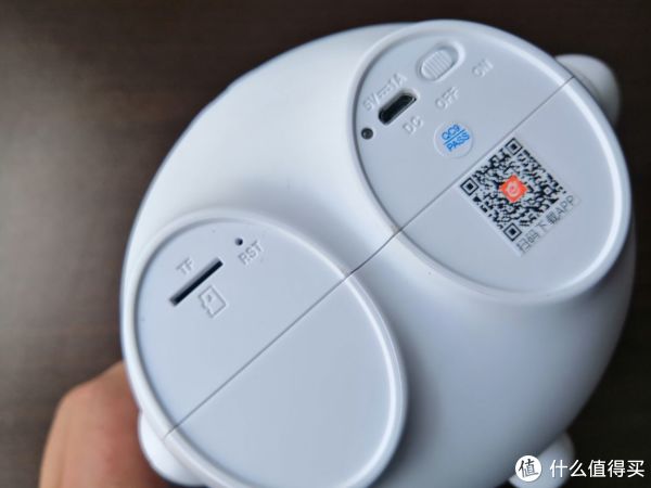 底部采用双脚的设计,2个椭圆形的双脚设计与桌面固定也比较稳定,底部还设置有一些功能按键,左脚是TF卡槽和RSE键,右脚是充电灯、充电口和开关机键。
