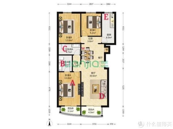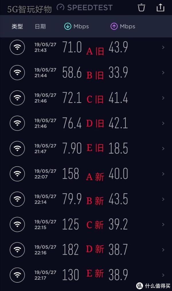 路由器W放置在餐桌旁,依次对A主卧、B主卧卫生间、C卫生间、D客厅、E厨房进行测速,单独对主卧躺床上测速,旧路由性能还是差了一些。