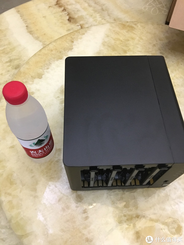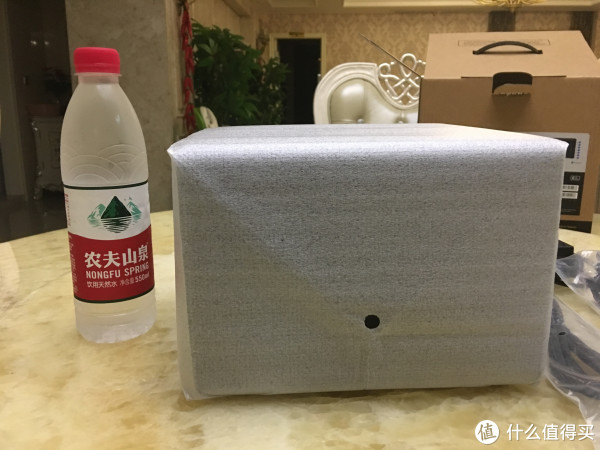 跟矿泉水对比下大小。看起来真的很小,没有想象中那么大。尺寸165 mm x 203 mm x 233.2 mm