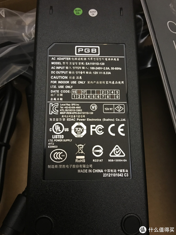 翌胜电子代工的电源适配器,广输入范围可以在全球各地使用,可以看到其输出为 12V 8.33A