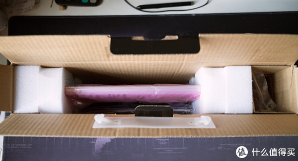 打开包装箱,可以看到笔记本电脑和电源适配器配件分别安放在不同的区域。两块减震泡沫牢牢地将笔记本电脑固定在包装箱内,最大限度地减少运输碰撞对电脑造成的伤害。