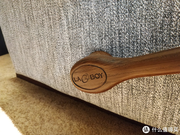 LAZBOY单人功能沙发其实最显著的标志就是这个木纹色的手动调节把手,一开始我以为是实木的,后来经研究发现,这个手柄应该是碳塑钢材质做的仿木纹,这样的材质应该是兼顾耐用的同时保留了温润的手感。