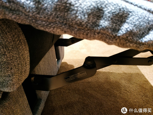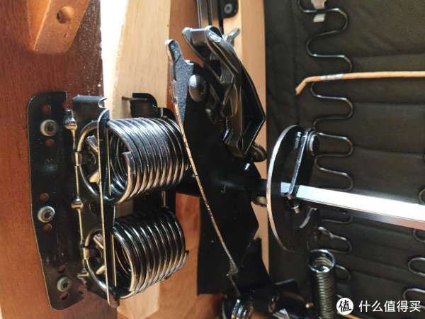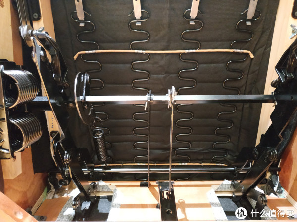 两侧有四个粗大的弹簧,应该是起到整个沙发的支撑作用。所能见到的钢制结构件看起来都非常粗壮厚实。