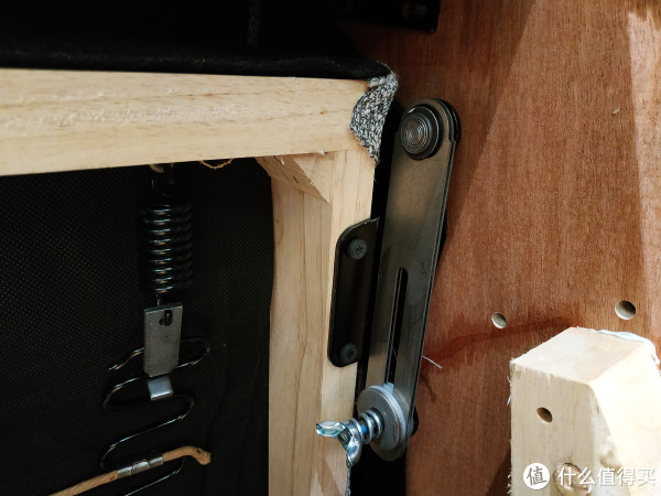 这个螺丝用于调节沙发靠背的松紧度,从内部可以看到这把沙发的整体木质框架,原木材质看起来非常结实。
