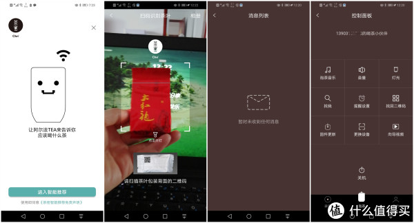 通过App顶部的一排四个功能菜单,还可以进行智能推荐、茶叶识别、消息通知和控制调整等操作。例如可以直接扫描茶叶包装的二维码自动识别品种,自动进行泡制参数设定。可以在控制面板中进行音乐选择、音量调整、灯光开关、增加提醒、更新固件和关机等等操作。