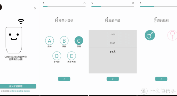 app中最为有趣的还是智能推荐功能。系统会根据你的年龄、性别、体型、体重、喝茶目标、身体健康状况、口味喜好和经济能力等,智能推荐出适合你喝的茶叶品种,以下就是我的选项推荐过程,系统推荐给我的是桐木关正山小种红茶,适合胃不好的我。如果你对推荐不满意,它还有N多个后续推荐供选择,总有一种适合你。