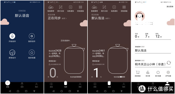 在app主页“泡茶”页面可以通过蓝牙连接大师壶,显示大师壶的工作状态,第几泡,可以看到有多少人正在使用大师壶。点击左下角键进入“录音”页面,令人更为惊喜的是她还会说多国外语和方言呢!如果仍然不满意,还可录制个性提醒语音。在“我的”页面可以查看大师壶使用数据,进行相关app设置等。