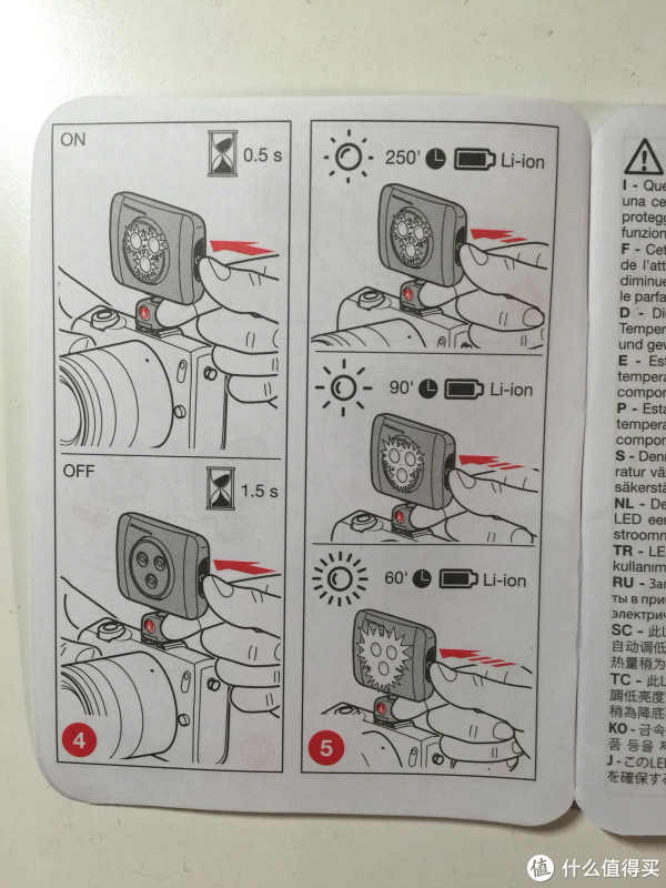可以看到通过自带的底座,可以将灯装到相机的热靴上或者是三脚架上。此灯有三挡亮度调节,分别能用60分钟、90分钟和250分钟。对于这么小的灯来说算是比较长的了。