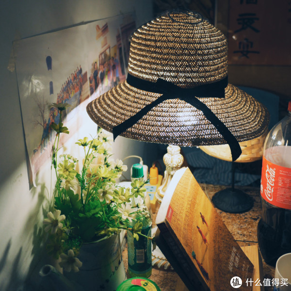 草帽、灯、绿植、书本,还有乱入的可乐瓶,凑一起倒是毫无违和感。