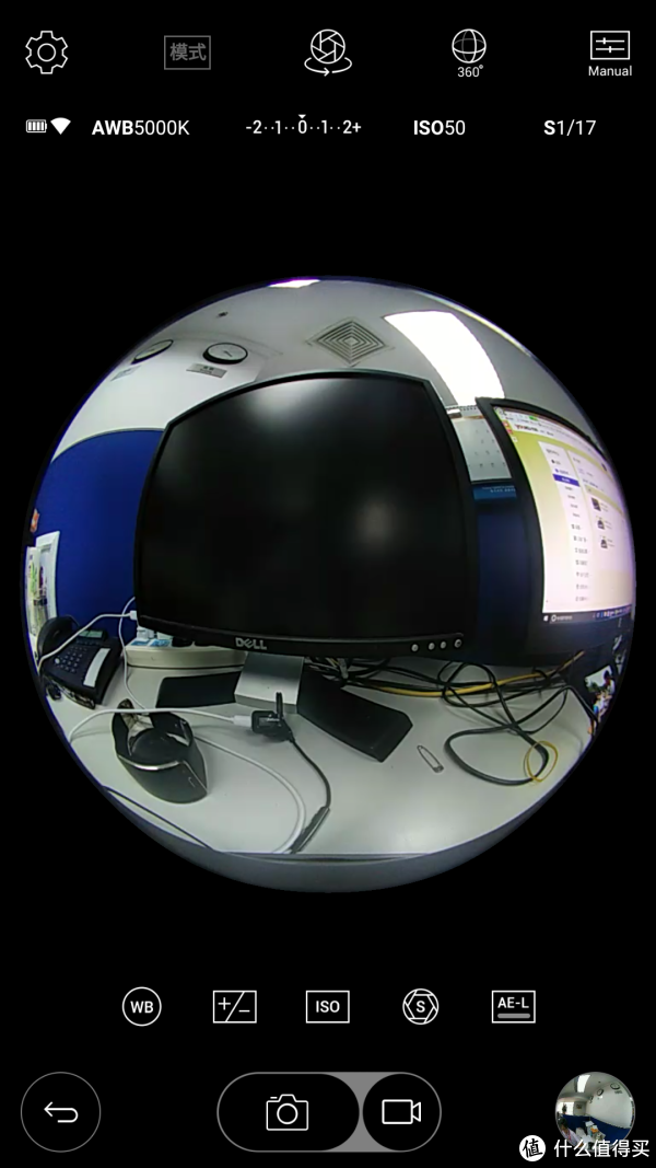 照相机可以设置拍摄的是180度照片或者360度照片,还有快门,曝光补偿等设置。中间的预览画面有一点点延时(不是全景的,只能看到前或者后一个镜头拍摄的效果。想用LG360实现实时全景直播是别想了。可能是考虑到wifi的带宽不够实时传输画面的吧。可惜了,本来还可以多种玩法的)