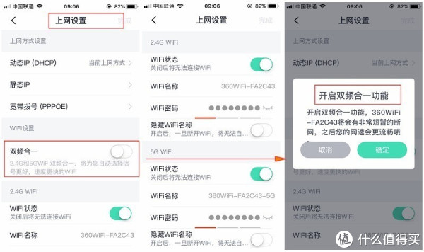 上网设置选项,可以看到内容是非常的丰富,360家庭防火墙路由器5Pro还支持双频合一,即在2.4G和5G信号中,自动选择信号更好的、更快的wifi;