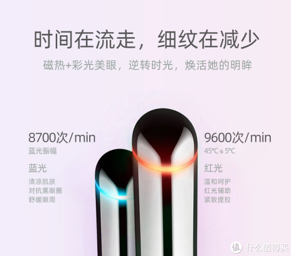 ★还有彩光提拉紧致的效果。蓝光显示下是按摩模式,可以有效减轻眼部浮肿,淡化黑眼圈;红光显示下是磁热提升模式,有45度磁热技术,三秒升温,搭配眼霜使用有助于导入吸收、改善干纹细纹、提拉紧致哦。