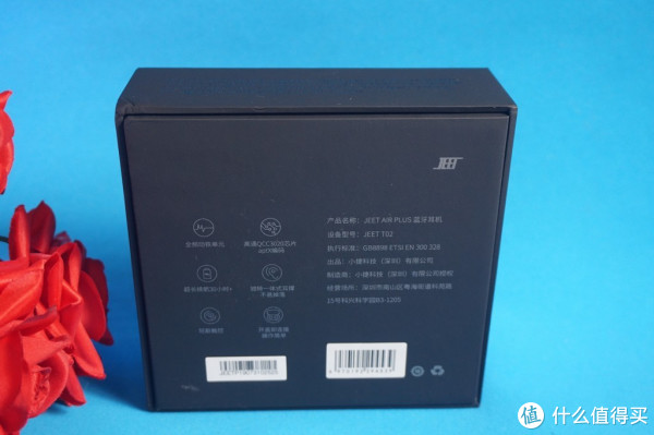 JEET AIR PlUS蓝牙耳机包装利用极简至精的理念,整个外包装没有使用过多的元素修饰,全黑色的包装颜色突出神秘色彩,包装正面中间采用烫金手法印制的一个大大的产品logo,两边各用反色的方法压制了产品的简画。背面用图文的方式注释出产品特征以及厂家信息。不过由于包装的材质使用了高密度的压制板材,体现出高品质的质感及硬度。