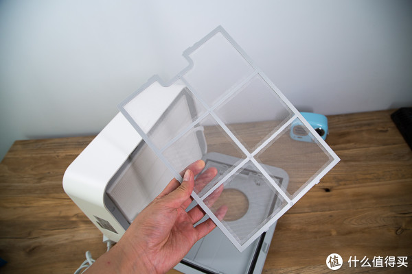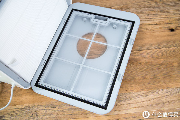 产品另一侧有一个初效滤网,可以预过滤第一层灰尘,并且抵挡小虫子一类的。日常初效滤网可以经常拿出来清洗一下。底层的尘盒也是一样需要经常清洁。