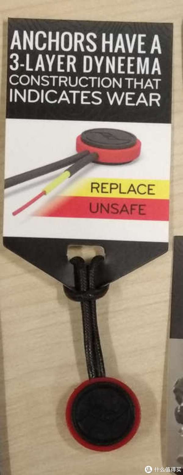 说说锚点。首先peak design宣称的锚点上的绳子可以承受200磅的拉力。但是长时间使用是存在磨损的可能。所以绳索设计成了多层多颜色。如下图所示,当表面黑色磨损之后就会露出黄色,这时就需要更换。如果继续磨损露出了红色,那么这个锚点就绝对不能使用了。