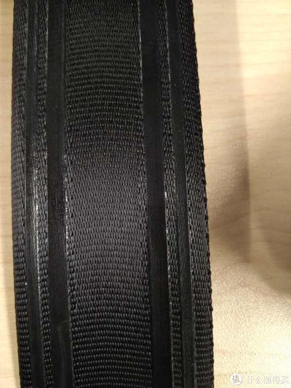 说说肩带本身。它是用汽车安全带的材料制成,非常结实。更巧妙的是在中间部分加入了软性材料(大概5mm厚)使得背负更加舒服。在软性材料那一部分的另外一侧,有防滑橡胶条,在单肩背的时候提供更多摩擦力。