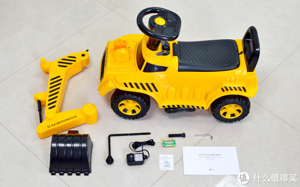 ▼配件方面,主要包含小车一辆,挖臂一只(带伸缩拉杆),挖斗一只,挖斗销子一件,手动档杆一只,电池两节(方向盘的喇叭用),L型扳手一只,充电器一只(7.5V/0.5A),以及合格证跟说明书各一份