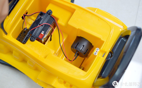 车座内有一块蓄电池,电池的电压为6V,通过导线往前端接入控制开关,再往后端接入驱动电机上