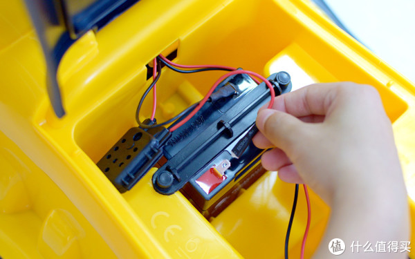 最后一步安装工作,是将挖掘机内部的电池通电:电池内置在车座下,需要使用配套的十字头扳手松开螺丝钉,扣开车座后面的锁片,将车座打开
