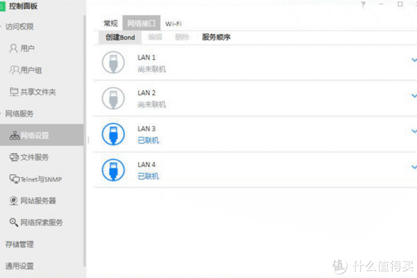 铁威马F4-421的四个网卡可以同时工作,根据自己的需求,在网络设置中可选择对应的模式。比如多条宽带接入就选择自适应负载平衡,为提高局域网速度就选择动态链接聚合模式。除了有线接入,这款机器还支持USB无线网卡接入(目前只支持部分网卡),在不方便走线的场合也能让NAS正常使用。