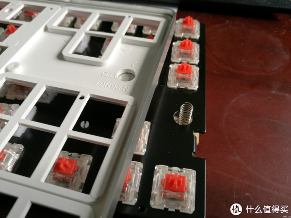 键盘的金属上盖是和一块塑料板拼接在一起,没扣键帽时候我还以为是白色钢板,估计是为了配色和防尘防水的关系才这么设计,底下的传统的黑色钢板没有缺席。