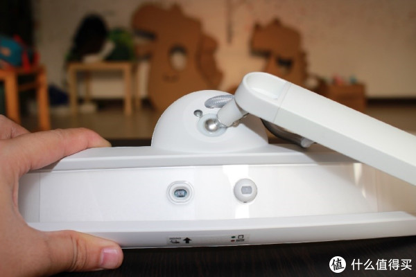 底座的正面,一个白白的平面,什么按钮开关也没有,明显区别于普通护眼灯,还有一个小小的金属立柱,用于连接底座与灯体,操作非常简单,只要把灯臂插在底座的金属头上,把螺丝旋紧就固定好了。