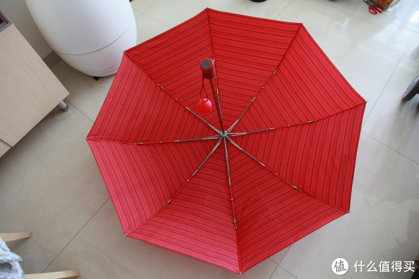 最后看一下伞把,手柄按钮上的标示表明这是一把自动开关伞。实际使用时,收伞只能保证伞骨折叠,想要中棒收回去还得靠手动,估计是伞比较大的缘故,回收要用点力气,如果是力气特别小的女生估计有点难。另外就是所有见过这把伞的人都会问这个小红球是干什么用的,当时买的时候问过店员,回答说,套上手感更好
