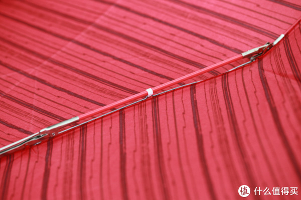 给伞骨来个特写,三折的伞骨只有最内侧那一折是纯金属,第二折是金属加纤维,第三折则是单纯的纤维了,不过在每一折的关节部位都是采用了金属来提高强度。最后珠尾是金属的,比塑料的耐用很多。
