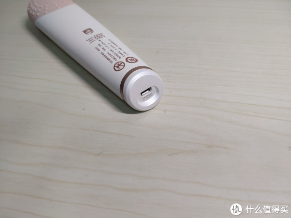 产品本身重量适中,5分钟左右不会有明显累赘感,外表才用类肤质涂层,使得握持手感更好,玫瑰金(或者说香槟金,原谅我区分不出来明显差别)搭配珠光白的配色也不落伍。背面按摩部分是软胶的,触感较舒适。充电接口采用micro usb藏在底部