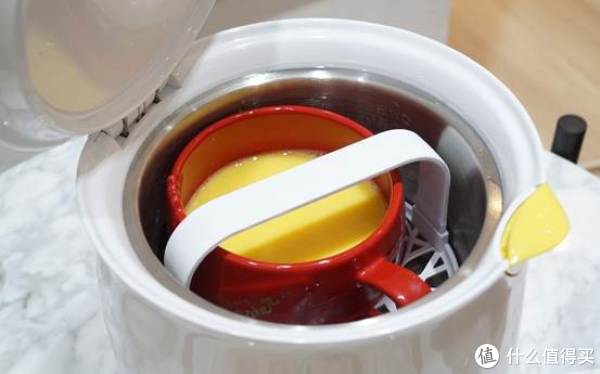 然后将装有蛋液的容器放置在多功能蛋架上,然后在长虹67℃温泉蛋机中注入水达到蒸蛋水位线。要注意的一点是,蒸蛋与煮蛋的注水以及放蛋架的顺序是调换的,蒸蛋是先注水再放蛋架,而煮蛋是先放蛋架再注水。