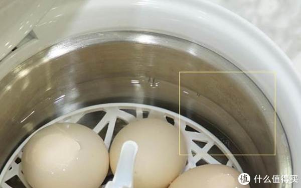 将内胆中的水量注满达到内胆壁上标注的煮蛋水线,也可以参照煮蛋架提手端的黄色标识处,锅壁的水线与蛋架的标识处的水位持平就表示注入的水量达到要求。