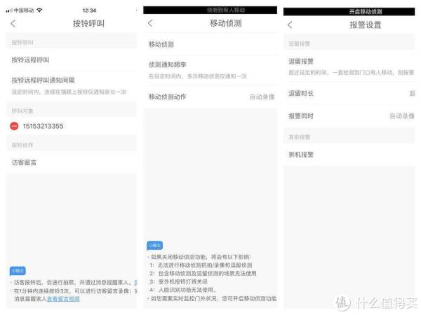 前三个功能分别是按铃呼叫、移动侦测、报警设置。“按铃呼叫”可以设置按铃远程呼叫和通知间隔的功能,如果是在一分钟内连续按铃超过3次,还能够进行访客留言录像;“移动侦测”会在室外有人出现或者停留时,做抓拍和录像,同时进行侦测动作和通知频率的设置;“报警设置”主要是进行逗留超时的报警和有人恶意拆机的报警。