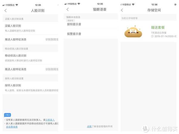 中间三个功能分别是人脸识别、猫眼语音、存储空间。“人脸识别”可以进行移动侦测人脸识别和按铃人脸识别,同时还能够将家人和熟人的面部数据录入系统,这样以后已记录的人员不会误触报警时间;而猫眼语音主要是进行按铃提示音和报警提示音的设置。