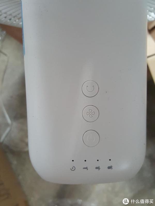机头上部是三个开光加四个指示灯,分别是摇头、风力、开关机,指示灯从左到右是预约/定时、低档风、中档风、高档风(强劲风)↑↑↑