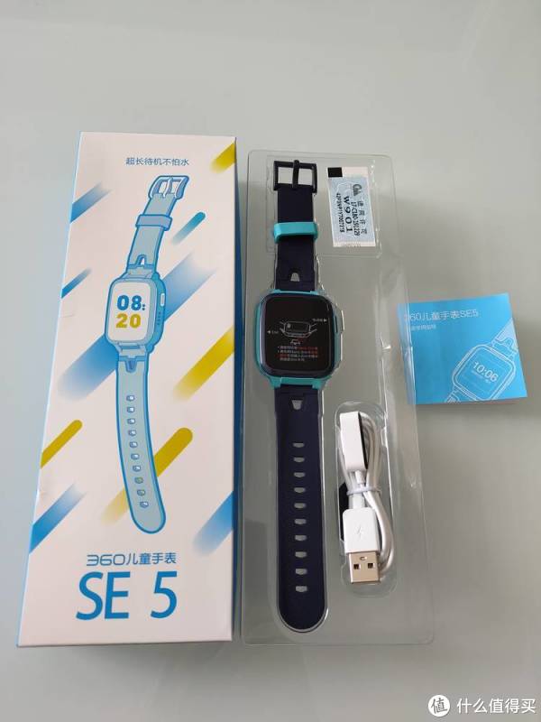 首先是包装盒,我拿到的360儿童手表SE5是宝石蓝色,包装盒采用蓝白色为主的设计,简约而时尚,正面是手表的概念图和型号,背面是产品信息和360儿童卫士的二维码。