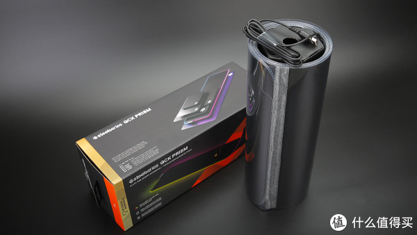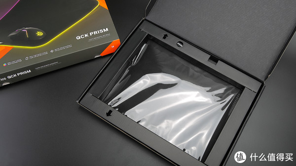 赛睿 Qck Prism Cloth游戏鼠标垫采用了纸盒包装,目前市面上的主流鼠标垫都采用了纸盒包装,运输更加方便和安全。虽然这款发光鼠标垫是可以随意弯曲的软垫,但是M号和XL号却分别采用了扁平和桶装的纸盒包装,笔者认为主要还是为了让鼠标垫更容易铺平考虑的。