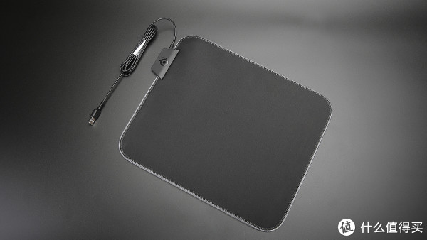 鼠标垫的外观设计比较低调,因为采用了灯带的设计,所以鼠标垫的表面采用了非常简单的黑色布面,没有任何图案设计。