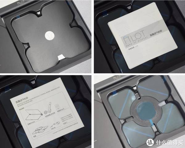 包装盒采用天地盖形式,盒盖之间有很强的阻尼,打开时废了不小的力气。取下盒盖后,我们首先看到的是百路达HUD的主机。主机表面覆盖了一层塑料膜,牢固的卡在底部黑色塑料托盘中。