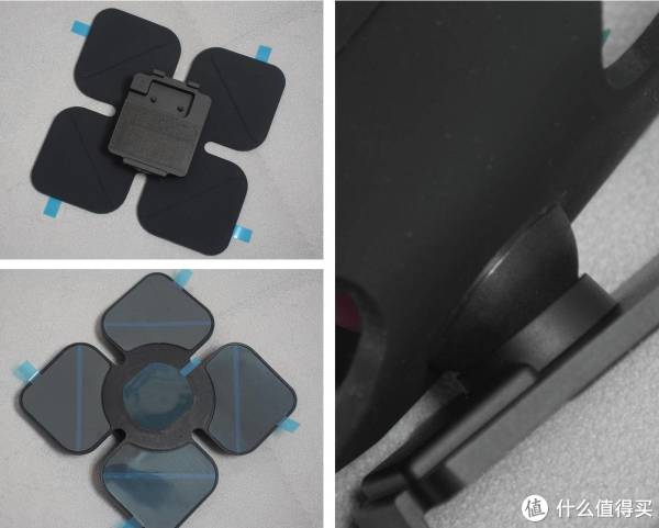 底座底部是一块软硅胶,方形的软硅胶切割成了四块,每块上都有定制的胶贴,为了适应不同车型,四块胶垫上还分别做了凹槽,这样就能更好的适应车中控台的弧度。软垫和底座卡扣之间采用球形连接,强力磁吸设计,可以大范围调整相对位置和角度。