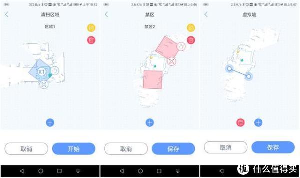 最值得称道的是自主设定区域和虚拟墙功能,你可以在房间平面图上任意划定一个方形区域来限定清扫区域,也可以划定禁区或画一条“虚拟墙”不许扫地机进入或越界,比通常的磁条式虚拟墙更方便灵活。这些功能对于需要反复清扫区域或保护不适宜扫地机清扫的地毯之类物品十分有用。
