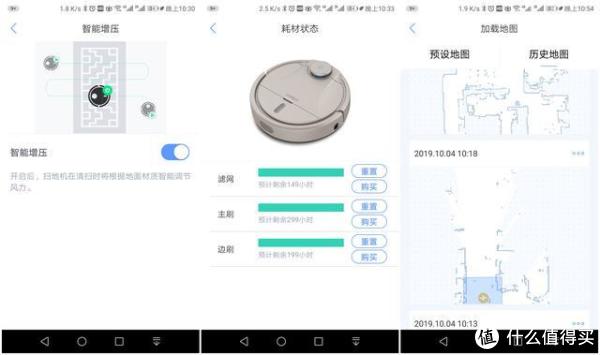 最新奇的当属智能增压和耗材状态智能提醒功能,居然可以自动识别地面材质然后自动调整吸力大小,这在其他同类扫地机中尚未见到过,耗材提醒功能也让你不用再费神去想着合适更换耗材了。