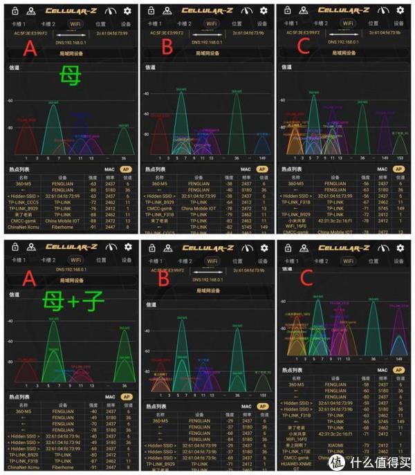测试环境是层高3米的三层楼,远方对单独使用母路由和子母路由共同使用的两种情况进行了测试。首先将母路由放置在B处,对A/B/C三点进行测试,然后将子路由开启放置在A处,再次对A/B/C三点进行测试。经过多次重复测试,结果如上图所示,朋友们肯定会有疑惑,在只有母路由的情况下,为什么1楼A处和3楼C处的网速相差如此之大呢?远方也是找了好久原因才发现原来二楼B处的母路由是放在实木电视柜上的,这样一来对的1楼来说就多了一个障碍物,如果将母路由挪到二楼地面时再在A处测试网速确实是和C处差不多的。所以Mesh技术就在此凸显出来了,在一楼没有子路由和添加子路由后的下载网速分别是6.9和15.3,两者可谓是云泥之别,而且信号强度也是有所改善,可见分布式子路由的强大作用;从二楼B处和三楼C处的对比情况来看,网速和信号强度没有看到太大的变化。