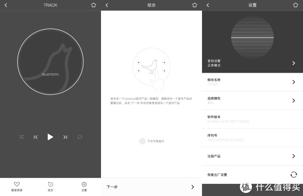 点击首页所连接的产品卡片,可以进入耳机的设置,其中第二个选项是Track耳机的一个特色功能,可以与另一款Libratone蓝牙产品一起播放相同的音乐,设置界面可以调整耳机的音效。APP界面设计的比较简洁,大部分功能有相应的介绍,各种功能也都比较容易找到和调整,整体体验还不错,唯一的缺点就是APP里没有找到显示耳机具体剩余电量百分比的界面,希望之后更新后能加上。