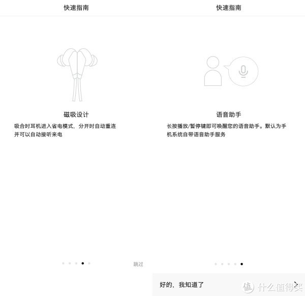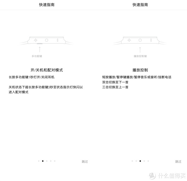 APP方面,APP需要登陆后使用,提供了微信授权快捷登陆选线,登陆后添加设备,添加设备后会先跳转到该设备的快速指南,关于线控的操作比较常规,按多功能键1s开关机、3s配对,“+”号键为加音量,“-”号键为减音量,中间播放控制断案暂停播放或接听挂断电话,双击下一曲,三击上一曲,长按唤醒语音助手,这里的设计我认为把上一曲和下一曲改为双击“+”“-”键比较好。
