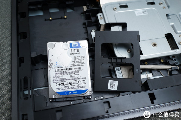 而下面就是2.5存笔记本硬盘,用硬盘缓冲架固定的(有个固定螺丝,需要拆除才可以拆下),这边配的是西数的蓝盘。