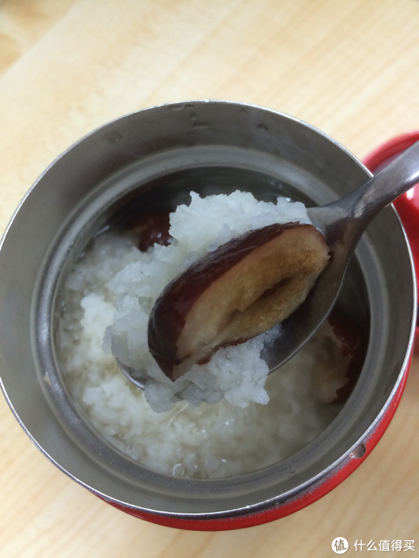 由于加了红枣,粥还是甜的,红枣也很烂了。