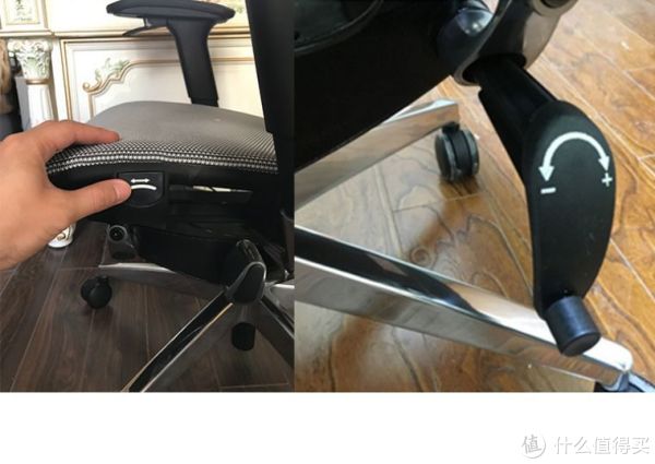 我手按住的位置是调节坐垫前后按钮,可以实现坐垫和背靠的同步调节,就是说你往后靠的同时坐垫会滑向前面一点,这样重心前移不会摔倒,也可以实现更大的后靠角度,右边图的摇把是调节后靠阻力大小的。