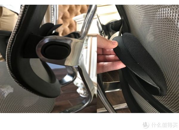 左图中可以看到左右两边有个按钮,可以调整椅背前后。右边图可以看到腰枕,腰靠部分,可以上下调节,幅度大概10cm,支撑感非常好,紧贴腰部。