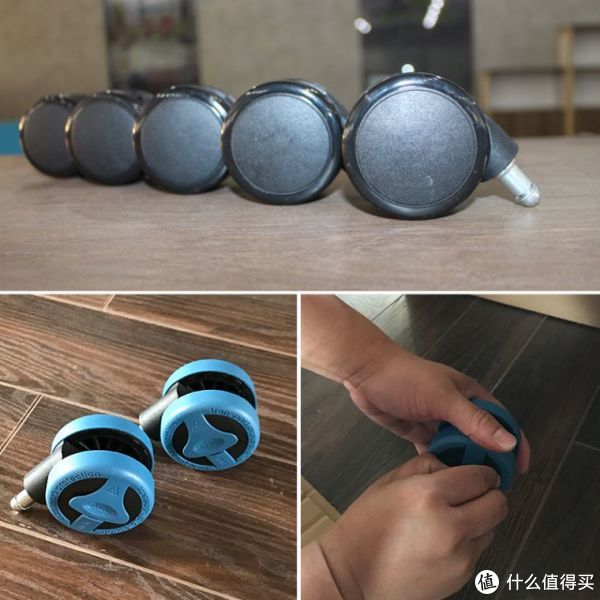 底座的万向椅轮,塑料件没有毛刺边,PU护皮也很厚实。